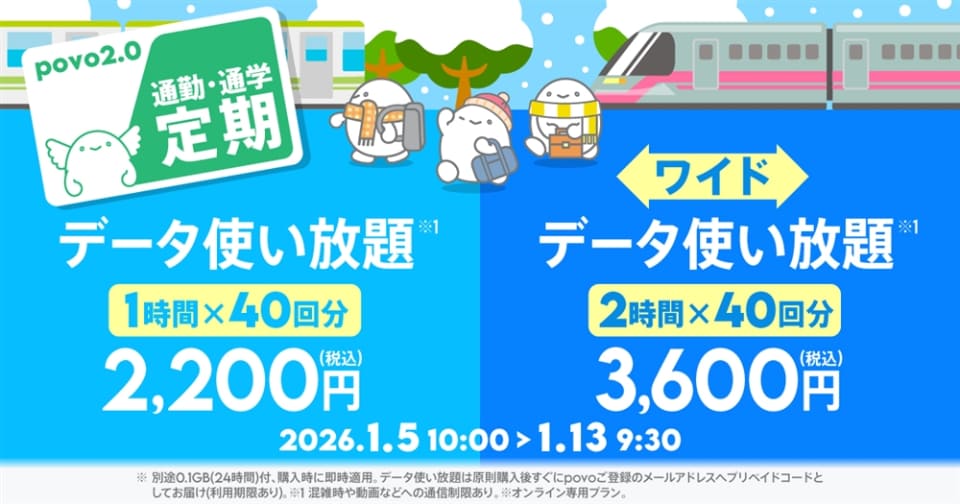 KDDIと沖縄セルラーは5日、オンライン専用ブランド「povo2.0」で、使い放題トッピングが40回分セットになった「通勤・通学定期」2種の提供を開始した。価格は2200円/回~。期間は1月13日9時30分まで。
