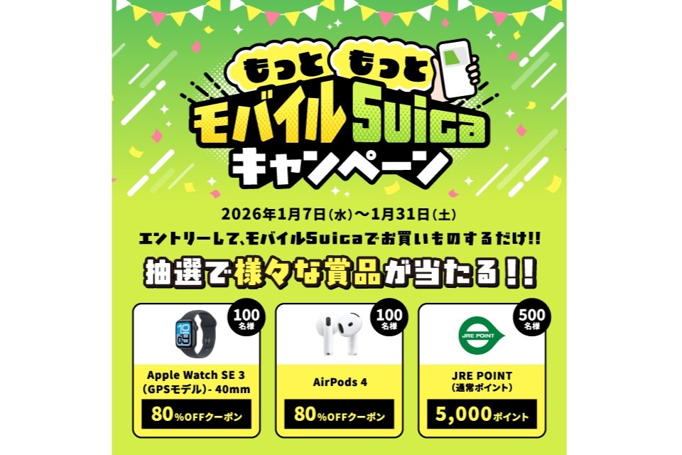 また、参加条件を満たすと50万名にモバイルSuicaの着せ替えカードフェイスが当たるほか、期間中にモバイルSuicaに新規入会または新規登録で1000名にJRE POINT 500ポイントが当たる。