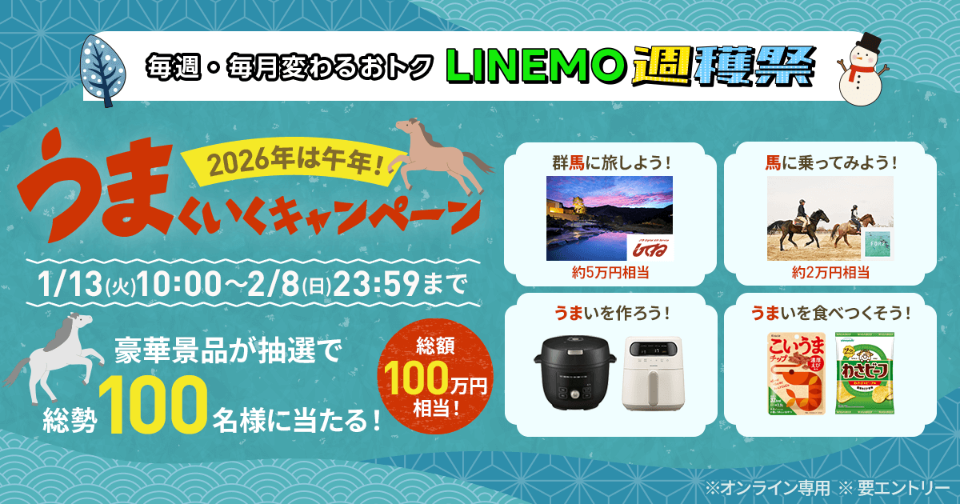 1月の月替わりキャンペーンは「LINEMO週穫祭 2026年は午年! “うま”くいくキャンペーン」。期間は2月8日まで。