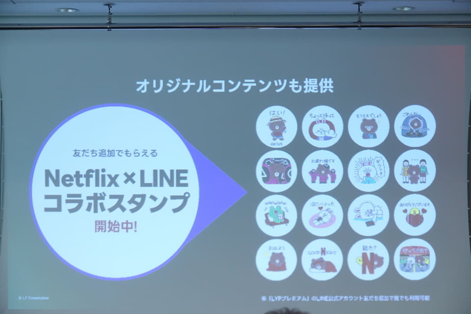 また、今回のNetflixとの提携について舛田氏は「今回の提携の中核は『見て話そう』。その第一歩としてセットプランを提供するので、今回のLINEスタンプ以外にも取り組みを進めていきたい」と積極的な展開を示唆。また、Netflix以外のグループ外提携も、進めていきたいとして「カテゴリーに関わらず、ユーザーのニーズが多いサービスとのパートナーシップを今後も継続していく」とコメント。エンタメなど特定のジャンルに絞らず、「オンライン/オフラインにこだわらず拡充を検討したい」と話した。今回のNetflixとの連携は、独占的な(Exclusive)ものではないとしており、これ以外の動画系サービスとの連携も考えられる。