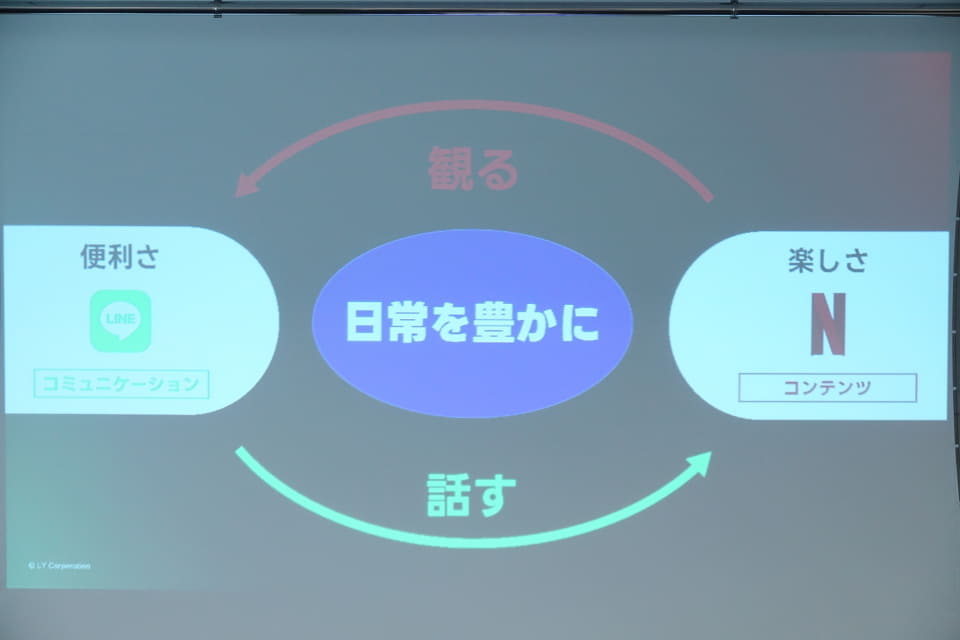ユーザーが評判のいい作品を視聴し、その感想をまたほかのユーザーに伝えるという、自然な会話でエンターテイメントが広がる“好循環”が作られていると指摘。幅広い年齢層で多くのユーザーが利用する「LINE」は、「Netflixの作品が語られる場所」と位置づけ、「Netflixでコンテンツを視聴し、その直後の熱量そのままに感想がLINE上で飛び交う体験を提供したい」とNetflix側の狙いを語った。