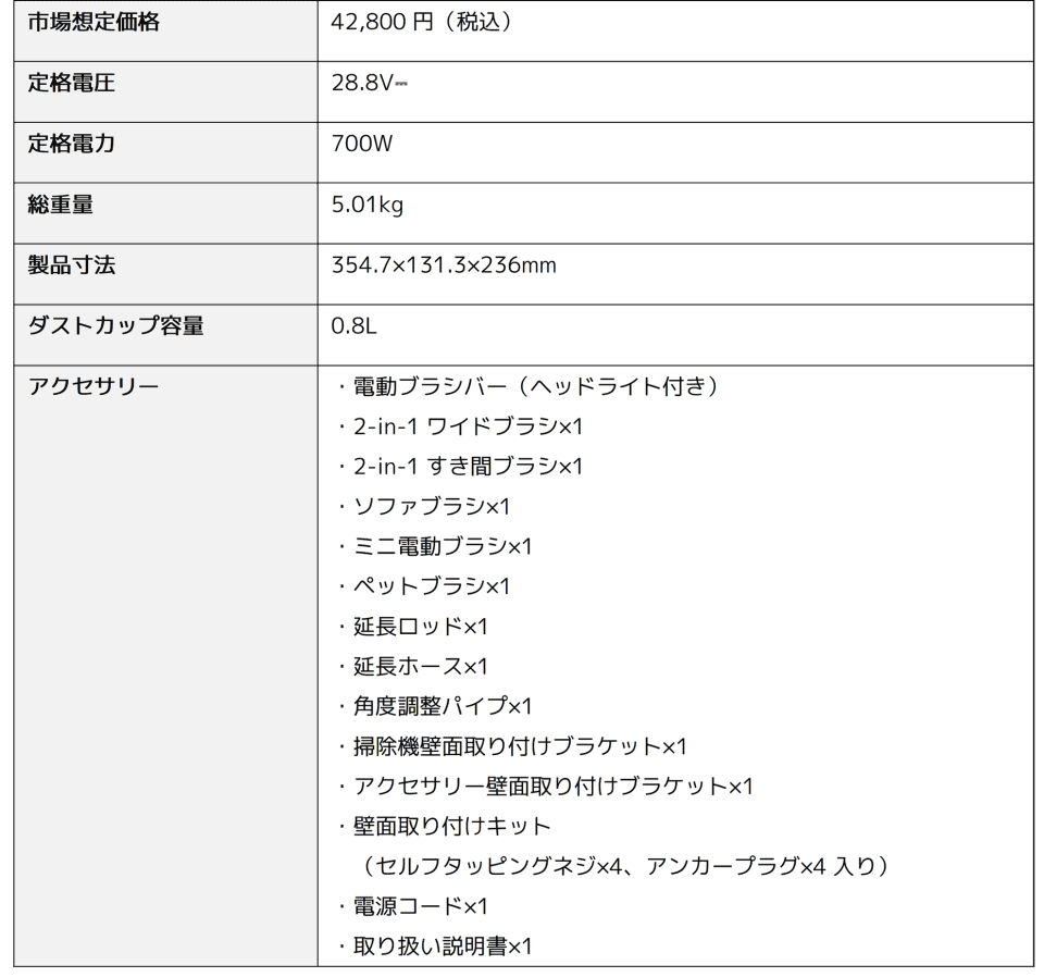 同機には、さまざまな床材に対応した電動ブラシバーを搭載している。髪の毛が絡まりにくいコーム状の設計で、手入れの手間を軽減。また、先端にはLEDライトを備え、隠れたゴミを照らし出し、掃除をサポートする。このほか、ペットのグルーミング専用ヘッド、角度調整パイプ、窓のサッシなどの掃除に便利な2-in-1ブラシノズルなどが同梱される。