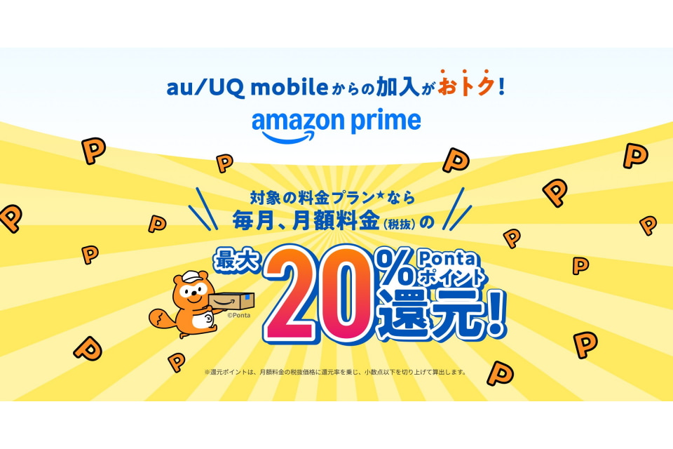 ニュース「サブスクぷらすポイント」にAmazonプライムを追加 20日~ 小板橋 望実2026年1月19日 11:35 KDDIと沖縄セルラーは、au/UQ mobileからの対象サービス利用でPontaポイントがたまる「サブスクぷらすポイント」に、「Amazonプライム」を20日に追加する。 「Amazonプライム」は、Amazon.co.jpでの配送特典や映像配信サービス「Prime Video」などが利用できるAmazonの有料会員プログラム。月額料金の税別価格に対して最大20%のPontaポイントが還元される。 最新機種の情報をチェックauUQ mobile