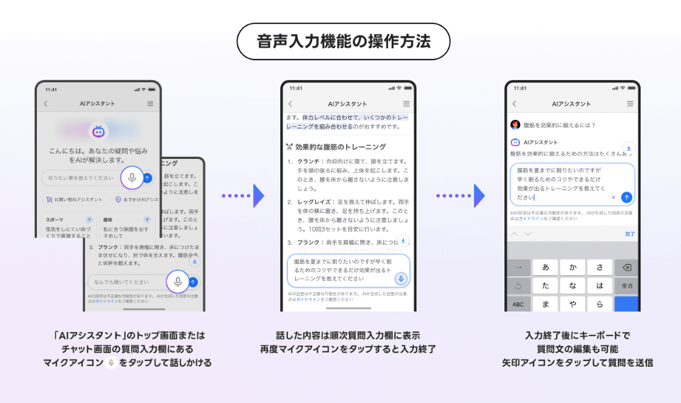 あわせて入力方法として、従来のテキスト入力に加え、音声入力に対応した。スマートフォンやパソコンのマイクで話しかけて入力できる。