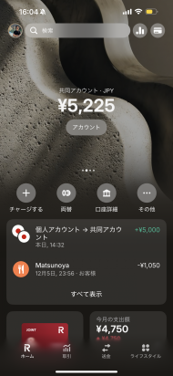 「共同アカウント」は、生活費や旅行、趣味の活動資金などを2人で管理するための機能。アカウントを開設すると、利用者それぞれに専用の「おそろいのカード」(リアルカードおよびバーチャルカード)が発行される。アカウント内の資金は共有される一方、支払いは各自が保有するカードで行える。