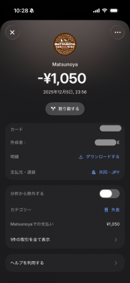 どちらかが決済を行うと、2人それぞれにリアルタイムでアプリ通知が届く仕組みで、離れた場所にいても互いの支出状況を即座に把握できる。これにより、家計簿の入力や月末の確認作業といった管理の手間を軽減し、透明性の高い資金管理を実現する。