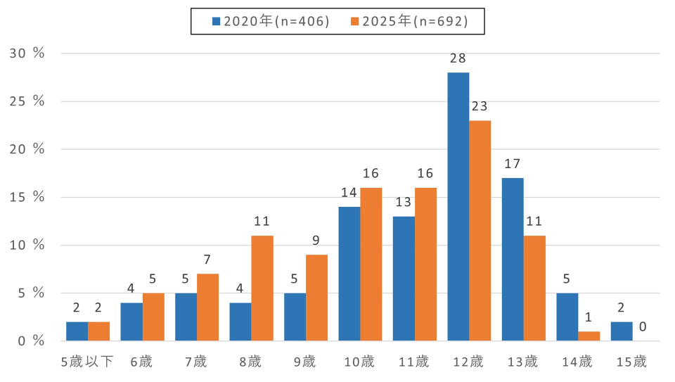 男女ともに最も多い所有開始年齢は12歳だが、2020年と2025年を比較すると、12歳で持ち始める割合は5ポイント低下している。一方で、11歳以下の低年齢層で所有を開始する割合が増加しており、特に8歳で所有し始める割合は5ポイント上昇している。
