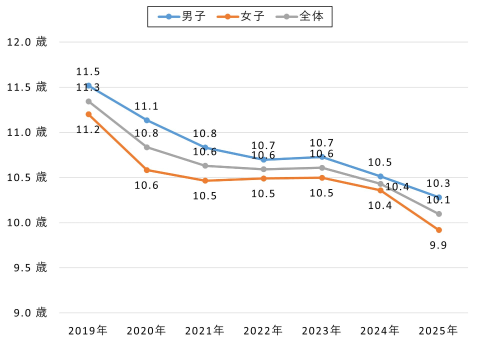 スマートフォンを所有し始める平均年齢は年々低下しており、全体では10.2歳となった。性別で見ると男子が10.4歳であるのに対し、女子は9.9歳となり、同研究所の調査開始以降で初めて10歳を下回ったという。
