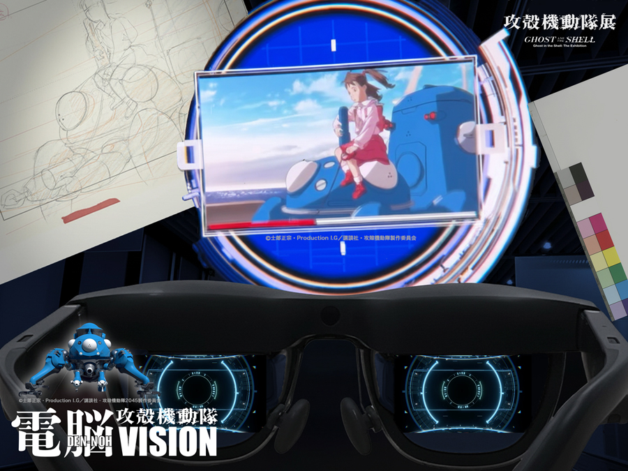 「電脳VISION」は、来場者がARグラスを装着して原画展示を巡る体験型コンテンツ。キャラクター「タチコマ」による解説を聞きながら、現実の展示空間に電脳通信ウィンドウやユーザーインターフェースが重なる演出を楽しめる。
