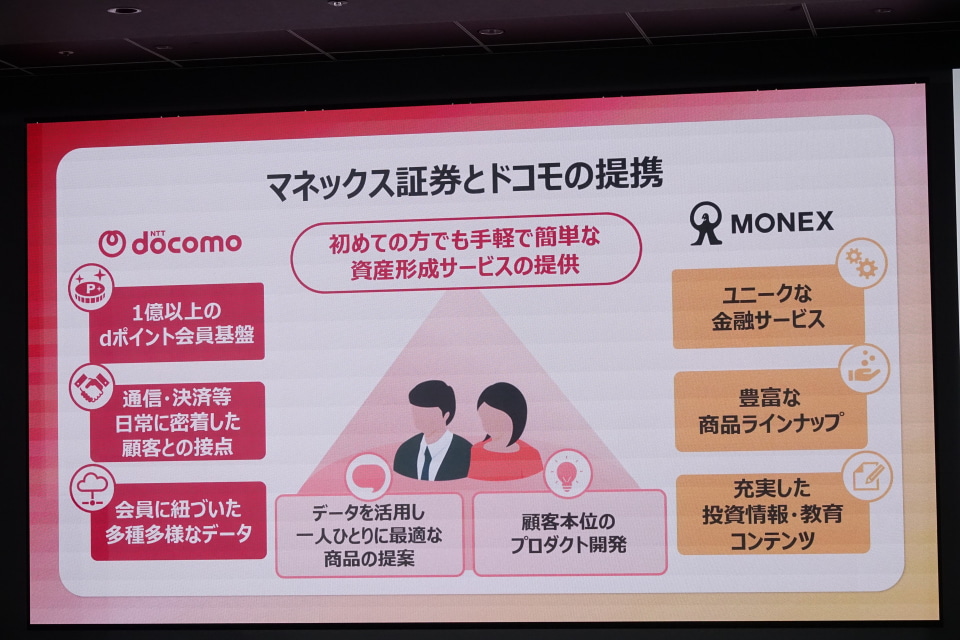 ネット証券会社であるマネックス証券では「顔が見える安心」を重要視してきたが、同時にネットだけでは「顔が見えず相談しづらい」などの課題も抱えていた。清明氏は「漠然とした不安にネット証券は応えられていなかった。ドコモショップが“ちょっとした相談”ができる場になるのは非常に良い」と話した。