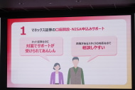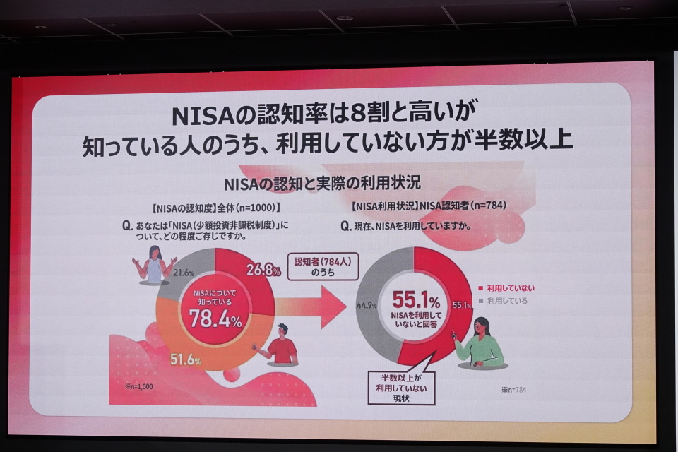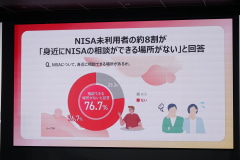 ドコモによると、今回の取り組みでもサポートされる「NISA」の認知度は8割に上る。一方で、実際に利用している人はそのうちの4割と、全体で半分を下回る。その要因のひとつには、身近に相談できる人がいないなど、始めるまでのハードルの高さがある。