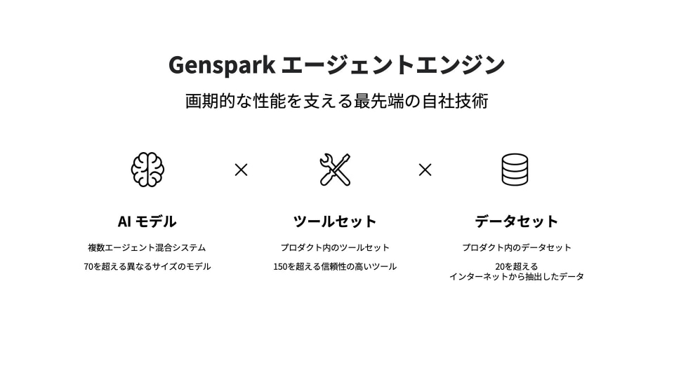 指示の内容に応じて、「Genspark」が自律的にタスクを分解し、複数から最適なモデルを選定してプロジェクトを進行するので、実際に業務で使えるアウトプットを生成できるとアピールする。