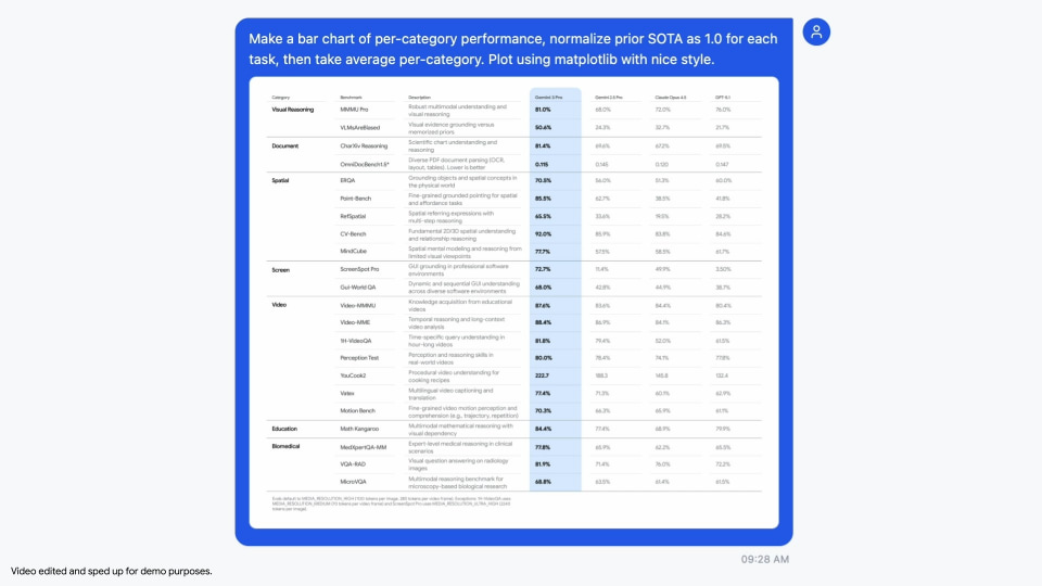 3つ目の「視覚的な計算とプロット」は、 画像内のテーブルデータを解析し、Matplotlib棒グラフを生成するもの。