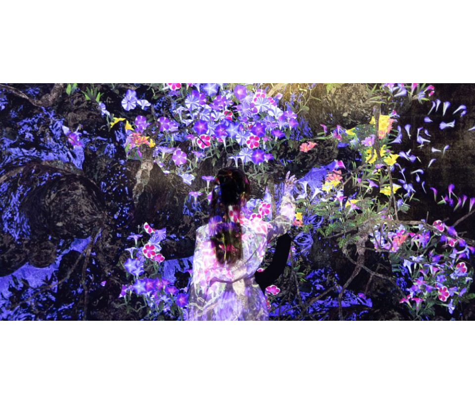 アート集団チームラボによるデジタルアート作品「永遠の今の中で連続する生と死」および「流れははるか遠くに」が展示される。来場者は、貸し出される折りたたみスマートフォン「Galaxy Z Flip7」を使って、時間とともに移ろう花々の空間を自由に撮影できる。