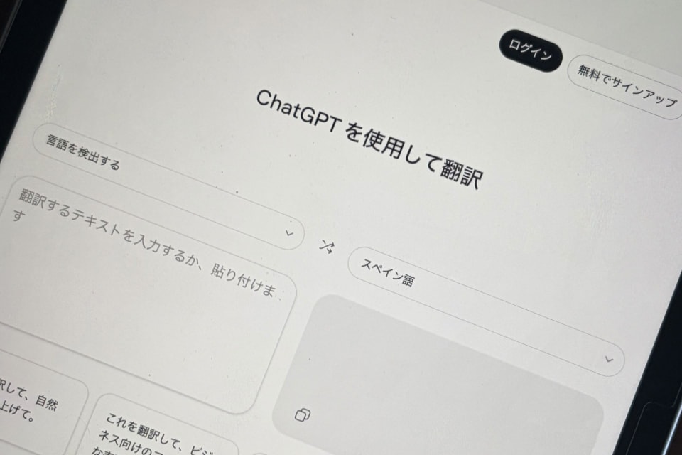 「ChatGPT Translate」は、ChatGPTへのログインなしでも無料で利用できる。ログインした状態では、翻訳後のテキストをそのままChatGPTに引き継ぎ、内容の要約やメール文面の作成といった連携機能が活用できる。