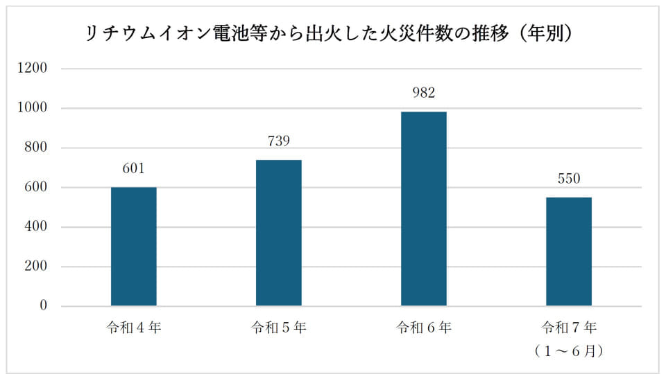 全国の合計件数は、令和4年が601件、令和5年が739件、令和6年が982件、令和7年1月~6月が550件。ごみ収集車やごみ処理関連施設から出火した火災は除いた件数となる。