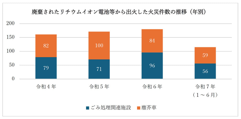 なお、リチウムイオン電池などを回収中のごみ収集車やごみ処理関連施設から出火した火災件数の合計は、令和4年が161件、令和5年が171件、令和6年が180件、令和7年1月~6月が115件だった。