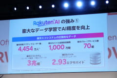 これらAIエージェントが動く秘訣を、三木谷氏は「データを統合できたから」と指摘する。楽天市場でこれまで蓄積したデータや、月間4000万人のユニークユーザー数に加え、1000万回線を超える楽天モバイルユーザーのデータも生かされていると説明。楽天市場の外でユーザーがどのような行動をしているかまでを分析することで、より精度の高い提案ができるようになるという。