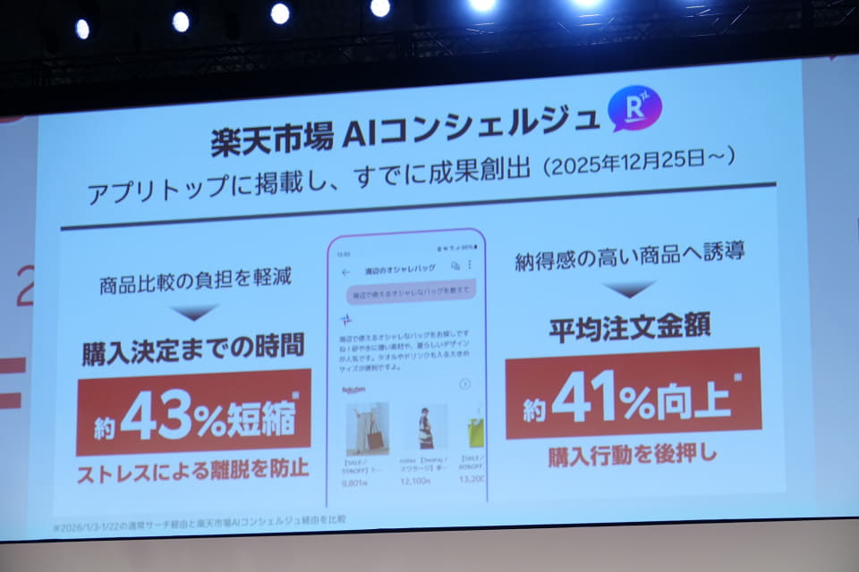 これらのAI開発では、実際に売り上げにつながる効果が出てきており、楽天市場のAIコンシェルジュでは購入決定までの時間を約43%削減、平均注文金額が約41%向上している。また、三木谷氏が「TikTokのような購入体験」と話す「ディスカバリーレコメンデーション」は、ユーザーの好みにあわせた商品がスクロールで次から次へと表示されるもので、今後もAIを使った機能強化が進められるという。