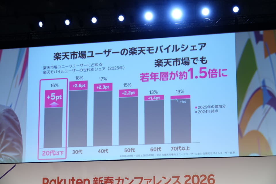 楽天モバイルがもたらす楽天エコシステムへの効果として、三木谷氏は購入額のほか年齢層にも注目し、「楽天市場の課題として若年層が薄いというものがあったが、楽天モバイルでは若年層の伸びが高まってきている」と説明。楽天モバイルから若年ユーザーを楽天市場に送り込むことで、楽天市場に直接的な効果を与えていると話す。
