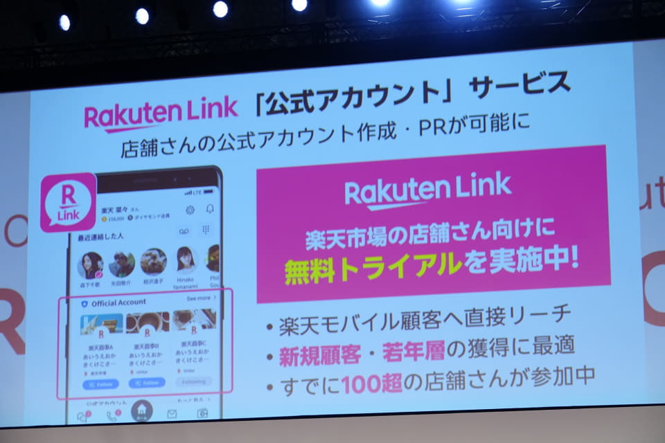 また、楽天モバイルの通話アプリ「Rakuten Link」からの送客も効果が上がっていると説明。Rakuten Linkアプリから楽天市場への送客が進んでいるほか、加盟店による「公式アカウントサービス」による送客も進んでいる。メールでの送客が難しいなか、アプリ経由でのメッセージで新規顧客の創出に寄与しているといい、松屋フーズでは新規顧客の45%近くがRakuten Link経由で獲得するなど、効果も上がっている。