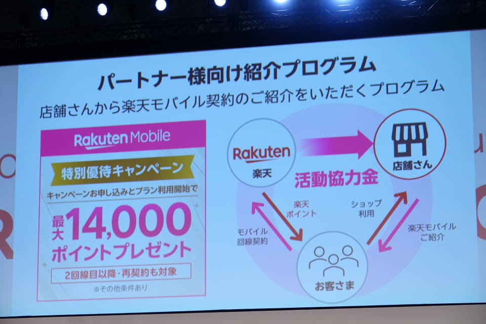楽天グループでは、楽天市場の加盟店が楽天モバイルをユーザーに紹介し、ユーザーが回線契約すると、加盟店に活動協力金が進呈される紹介プログラムを実施している。