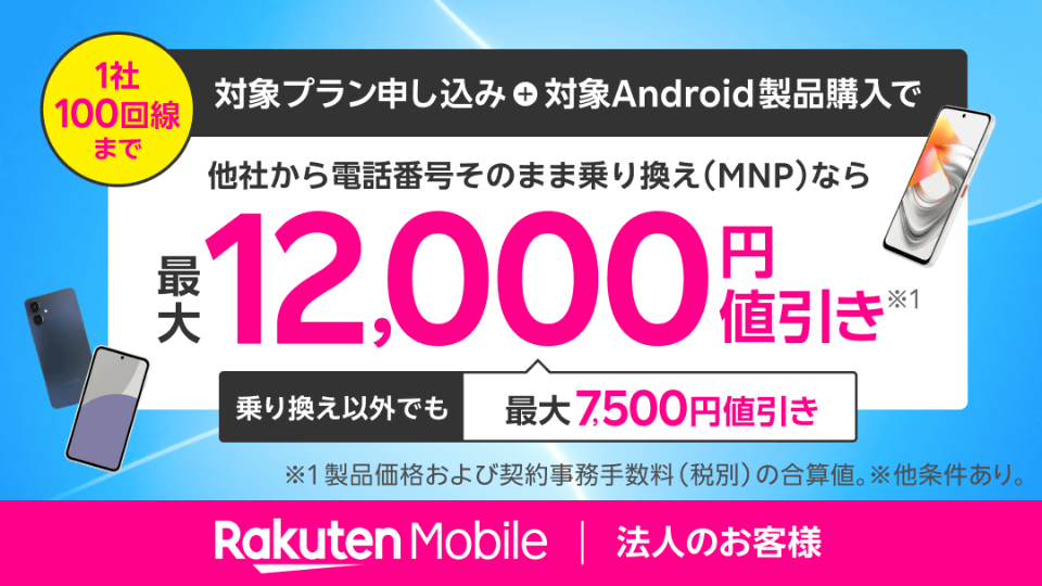 楽天モバイルは、法人向けサービス「Rakuten最強プラン ビジネス」において、対象のAndroidスマートフォンが値引きされる「Android乗り換え&新規おトク割」を開始した。終了日は未定。