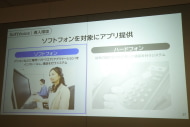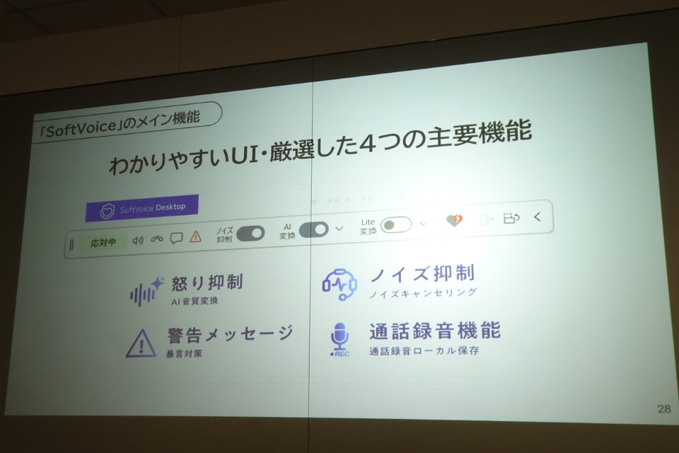パソコンにソフトをインストールして利用する「ソフトフォン」を対象にアプリケーションのかたちで提供されるサービス。「怒り抑制」「警告メッセージ」「ノイズ抑制」「通話録音」の4つを主な機能とする。