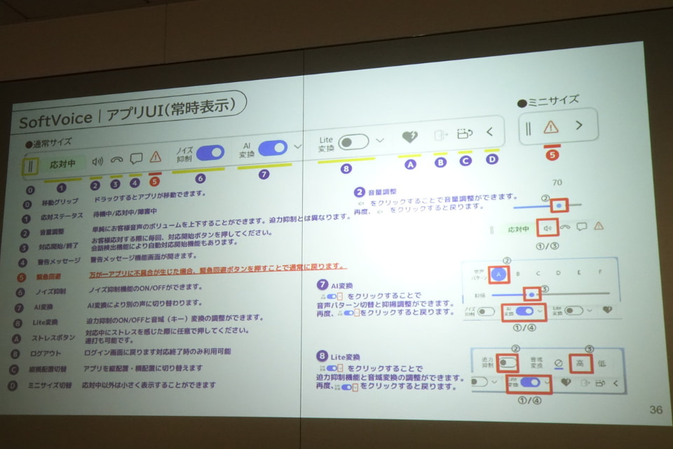 怒り抑制は、AI音声変換技術を活用して通話の内容を変えずに「怖くない声」にリアルタイム変換する。アプリの操作だけで簡単に切り替えることができ、音声パターンは150種類からオペレーター自身が選べる。声質のほか、人によっては恐怖を感じる抑揚もスライダーで好みの具合におさえられる。