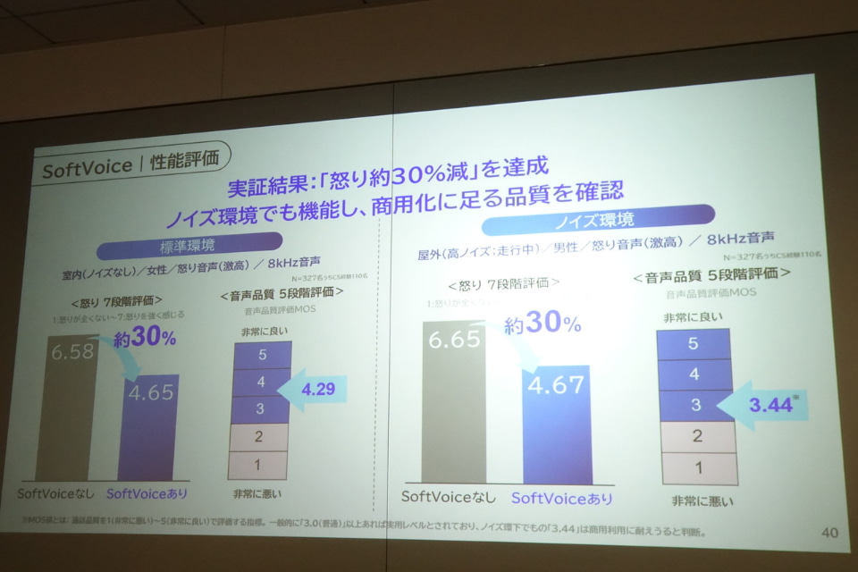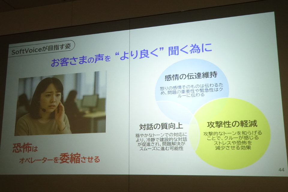 AIで「安心できる声」に変換することで、脳の萎縮を防ぎ、本来の冷静な対応が可能になる。中谷氏によると実証実験を通じて、SoftVoiceありの場合は、なしの場合と比べて怒りの評価指標が30%以上軽減することが確認された。