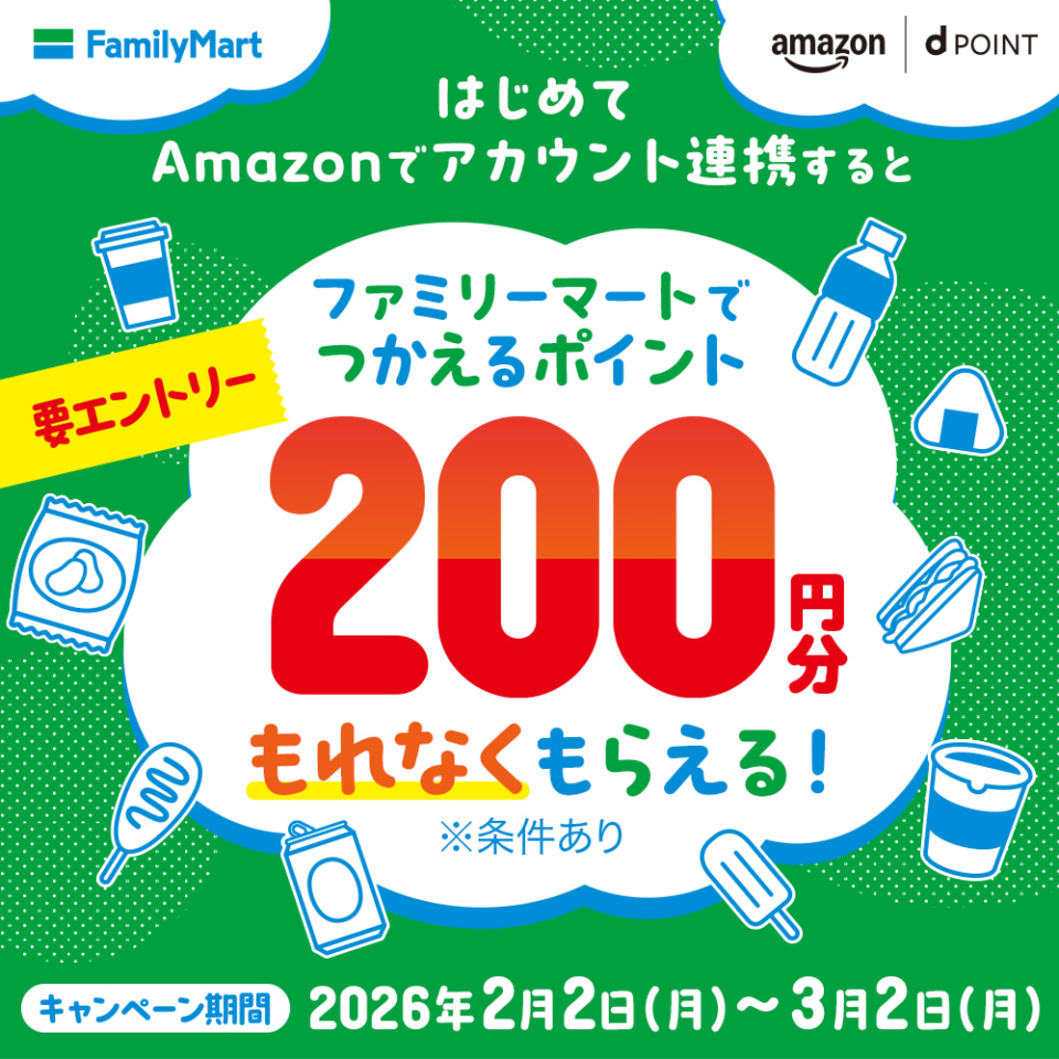 期間中にキャンペーンサイトからエントリーし、Amazonアカウントとdアカウントをはじめて連携すると200ポイントがもらえる。特典は「期間限定ファミマポイント」もしくは「dポイント(期間・用途限定)」のいずれかを選択できる。