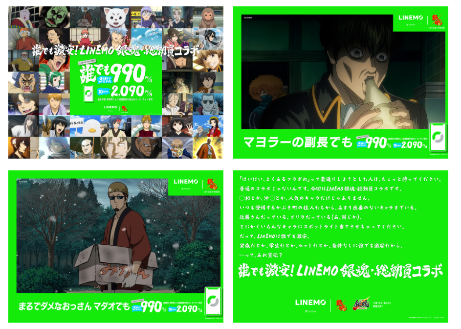 「誰でも3GBまで月額基本料990円」などのLINEMOのサービス特徴を、銀魂ならではのユーモアを交えてアピールするWebCMなどが展開される。キャンペーンには、主人公の坂田銀時をはじめ、志村新八、神楽といった万事屋メンバーなど、総勢50人以上が登場する。