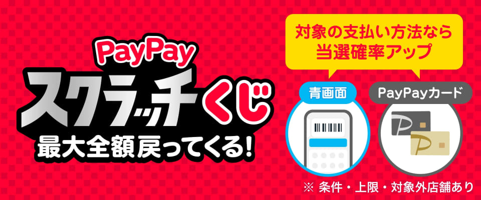 「PayPayスクラッチくじ」は、本人確認済みのユーザーが、期間中対象店舗でPayPayまたはPayPayカードで1回あたり200円以上決済すると抽選が実施され、最大決済額の全額分がポイント還元される。