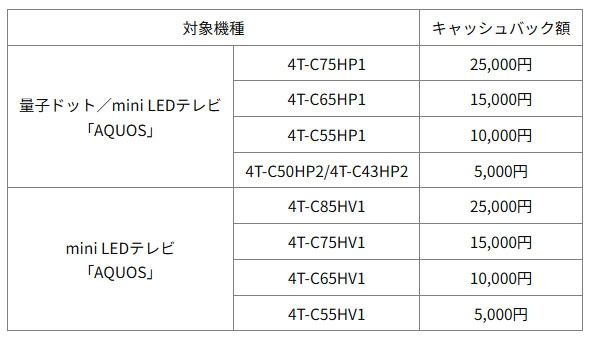 対象のAQUOSを購入し、キャンペーンサイトから応募すると、機種に応じて最大2万5000円がキャッシュバックされる。