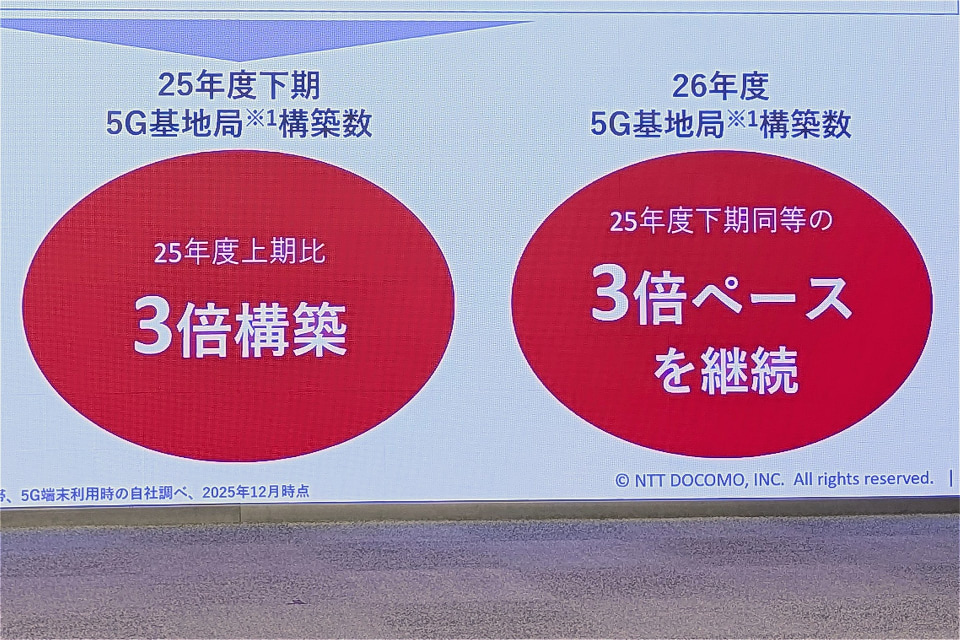 2026年度、ドコモでは基地局設置ペースを2025年度上期の3倍で進めていく。これまでは「2025年度下期は、上期の3倍」とされており、5日の決算で、2026年度の方針が初めて示されたことになる。