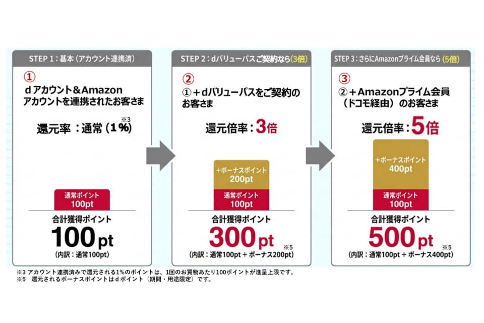 アカウント連携済みでdバリューパス契約者の場合は3%還元。アカウント連携済みでdバリューパス契約者かつ、Amazonプライム会員の場合に5%がポイント還元される。