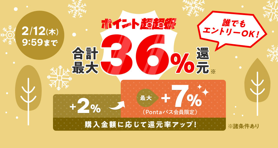 期間中、購入金額に応じてPontaポイント(au PAY マーケット限定)が最大7%還元されるほか、各店舗からの特典や「買い得メンバーズ」の特典などを合わせると最大36%の還元を受けられる。さらに、Pontaパス会員であれば、2月8日に対象商品を購入することで最大還元率は41%となる。