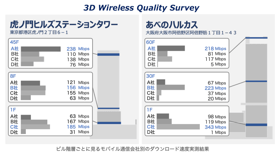 たとえば、東京の虎ノ門ヒルズ ステーションタワーでは、高層階ではA社、中層階ではB社、低層階ではC社がダウンロード速度が最も速い結果になった。また、大阪のあべのハルカスでも、同様に階層によって通信速度が異なる結果が得られた。
