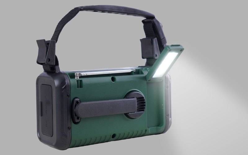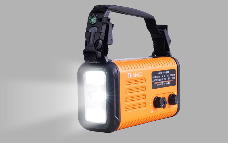LED懐中電灯や読書灯、SOSを知らせるアラームや笛、3.5mイヤホン端子を備えるほか、コンパスなど災害発生時や避難生活に役立つ機能が搭載されている。