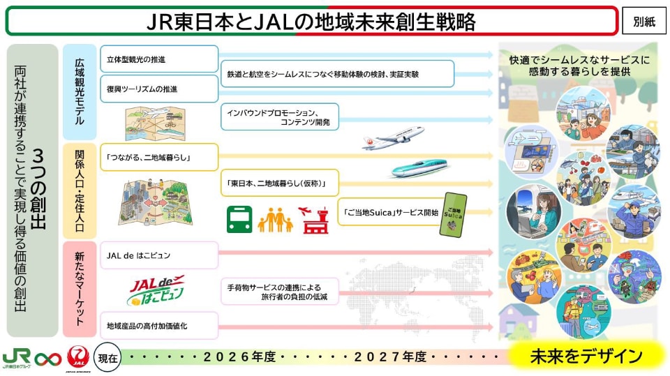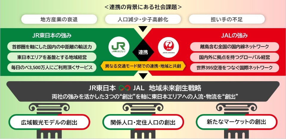 両社は協定を"地域未来創生戦略"と位置づけ、「広域観光モデルの創出」、「関係人口・定住人口の創出」、「新たなマーケットの創出」の3つの創出による、鉄道と航空の強みを活かした取り組みを展開することで、東日本地域の地方創創生に貢献する。