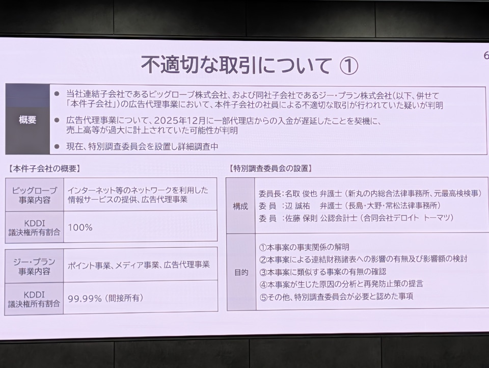 KDDIは、元最高検検事らを含む特別調査委員会を設置し、事実関係の解明と再発防止策の策定を進めている。今後、同委員会による調査結果によって、影響額が増減する可能性もある。