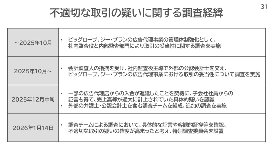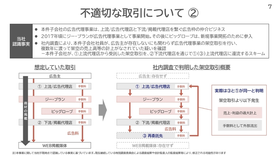 複数年だと認識しています。ジー・プランは2017年度、ビッグローブは2022年度から事業を行っています。今回はこの全てが架空取引と想定して算出しています。いつから、どこからなのかは特別調査委員会の調査中です。