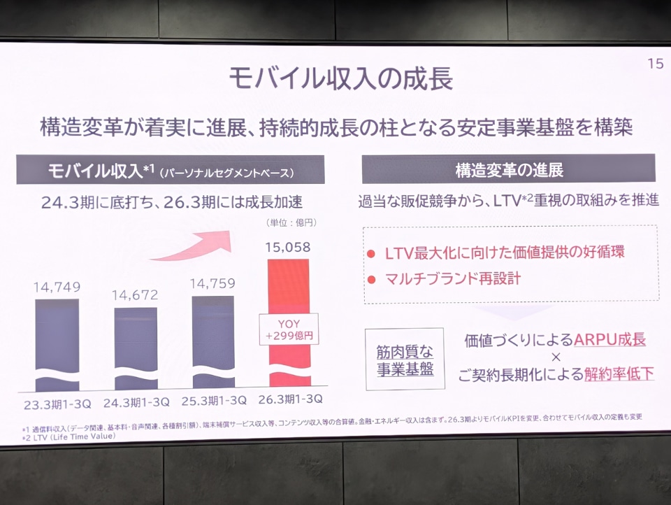 今回の説明会の最大のトピックは、主力であるモバイル事業のV字回復。2023年度に底を打ったモバイル収入(パーソナルセグメントベース)は、今期に入り成長が加速。第1四半期から第3四半期の累計では、前年同期比で約299億円の増収を記録した。