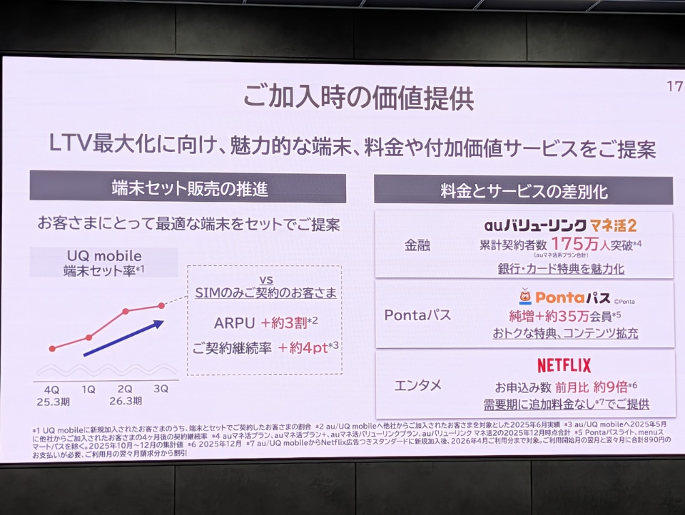 サブスクぷらすに加入いただくと最大5カ月無料になるキャンペーンで、auとUQ mobileのユーザーにしっかり入っていただいています。Netflixの商品力で入っていただいている部分もありますが、しっかり使い続けてもらうことが大事だと考えています。これを継続して、「長く使っていただく」ことにつなげたいと思います。