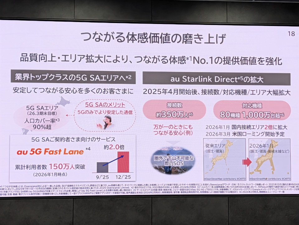 「つながる体感価値」の向上に向け、5G SA(スタンドアローン)エリアの拡大を進めており、2026年3月期末には人口カバー率90%超を目指すとしている。また、能登半島地震などの経験を活かし、Starlinkやドローンを活用した災害対策も強化している。
