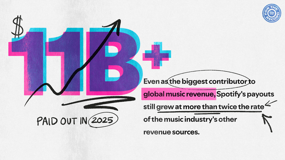 2025年における音楽業界への支払額は110億ドルを突破し、前年比で10%以上の成長を遂げた。Spotifyは世界の録音音楽収益の約30%を占めており、ロイヤリティの半分は独立系アーティストやレーベルへ支払われた。同社によると、年間で10万ドル以上の収益を得るアーティストの数は、CD全盛期の店頭に並んでいたアーティスト数を超えているという。