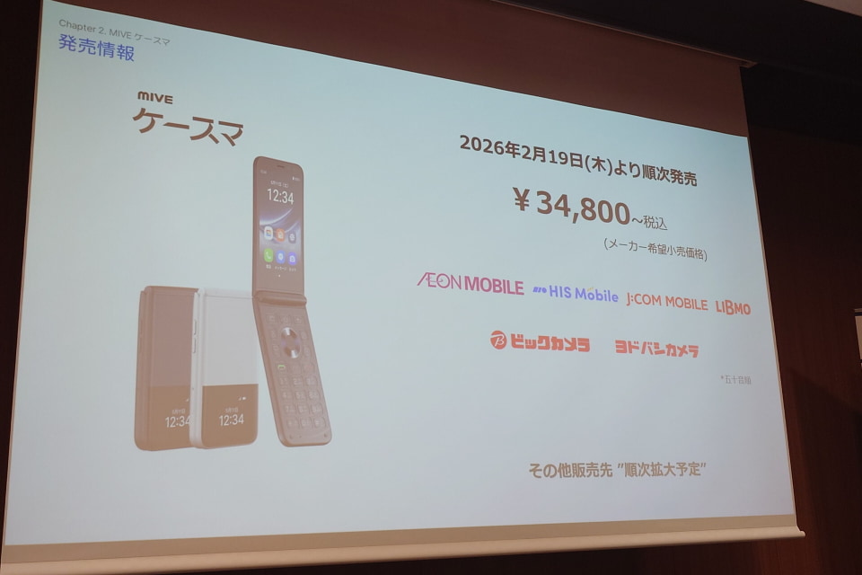 MIVE ケースマは、折りたたみ型の携帯電話。スマホの操作に不慣れなもののLINEなどを利用したいシニア層に向けた製品で、Android 14 Go Editionを搭載する。本体の大きさは127.8×65.3×16.2mm、重さは約195g。