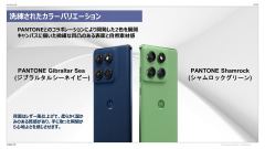 motorola edge 60 proでも採用された「クアッドカーブデザイン」により持ちやすさを実現した。米国国防総省が定める調達基準「MIL-STD-810H」に準拠した耐久性と、IP68の防水防塵性能を兼ね備える。