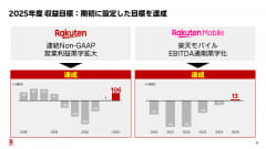 楽天モバイルでは、2025年12月に契約回線数が、MVNO回線なども含めて1000万回線を突破した。2025年度の目標として掲げていたもので、三木谷氏は「ユーザーはもちろん、パートナー企業や支援いただいた方にあらためてお礼申し上げる」とコメント。新規顧客の獲得コストなどを考慮したEBITDAは、前年比+667億円の129億円となり黒字化を達成。「力強い成長と堅調な収益改善を示せた」(三木谷氏)と評価した。