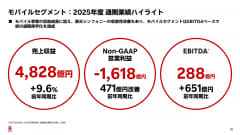 楽天モバイルと楽天シンフォニーを含めたモバイルセグメント単体の売上収益は、前年比+9.6%の4828億円。Non-GAAP営業利益は、前年から471億円改善し-1618億円。EBITDAは、前年比+651億円の288億円となった。モバイルセグメントでも初のEBITDA通期黒字化を達成した。
